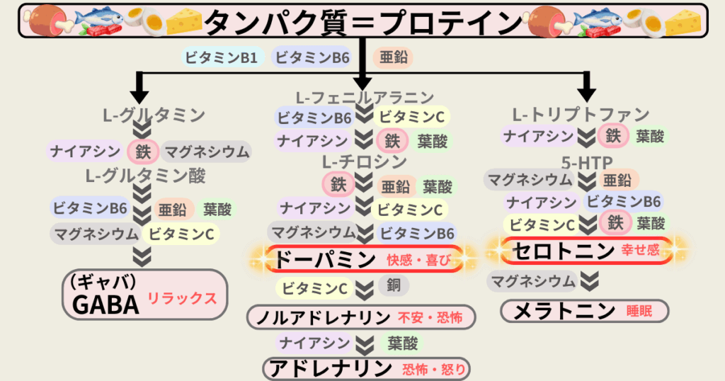 なぜなら、「やる気」や「幸福感」を生み出す“神経伝達物質”たちは、ぜ~んぶ”タンパク質”から作られているからです。
