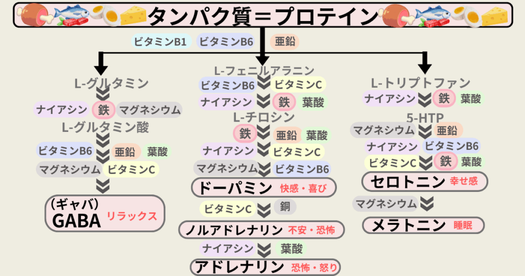 というのも、”やる気”や”幸福感”をつくる「神経伝達物質」を作りだすためには、まず「タンパク質」、そして次に必要なのが―そう、鉄分なんです。
